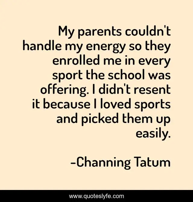 This page presents the quote "My parents couldn't handle my energy so they enrolled me in every sport the school was offering. I didn't resent it because I loved sports and picked them up easily.". Author of this quote is Channing Tatum. This quote is about me, school, parents,.