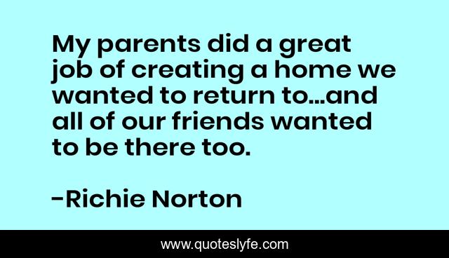 This page presents the quote "My parents did a great job of creating a home we wanted to return to...and all of our friends wanted to be there too.". Author of this quote is Richie Norton. This quote is about confidence, self-mastery, mindful, marketing, work, success, self-help, entrepreneur, innovation,.