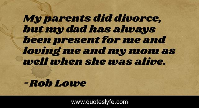 This page presents the quote "My parents did divorce, but my dad has always been present for me and loving me and my mom as well when she was alive.". Author of this quote is Rob Lowe. This quote is about me, parents, loving,.