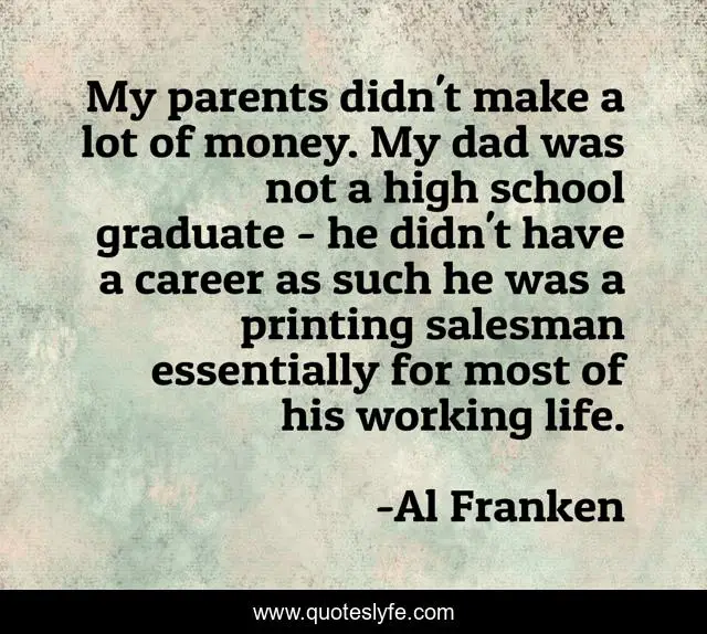 This page presents the quote "My parents didn't make a lot of money. My dad was not a high school graduate - he didn't have a career as such he was a printing salesman essentially for most of his working life.". Author of this quote is Al Franken. This quote is about money, life, parents,.