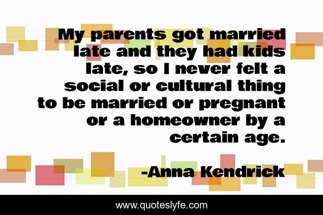 This page presents the quote "My parents got married late and they had kids late, so I never felt a social or cultural thing to be married or pregnant or a homeowner by a certain age.". Author of this quote is Anna Kendrick. This quote is about late, kids, parents,.