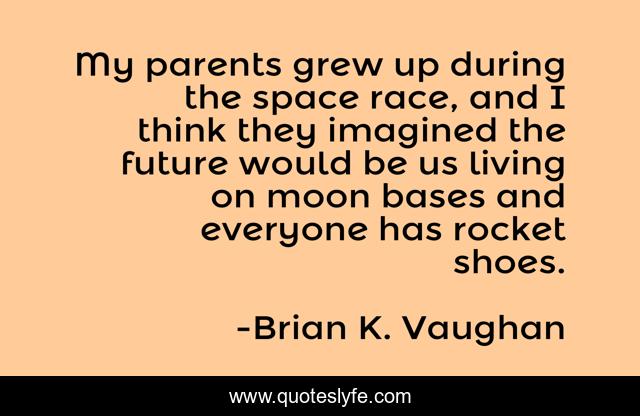 This page presents the quote "My parents grew up during the space race, and I think they imagined the future would be us living on moon bases and everyone has rocket shoes.". Author of this quote is Brian K. Vaughan. This quote is about future, parents, moon,.