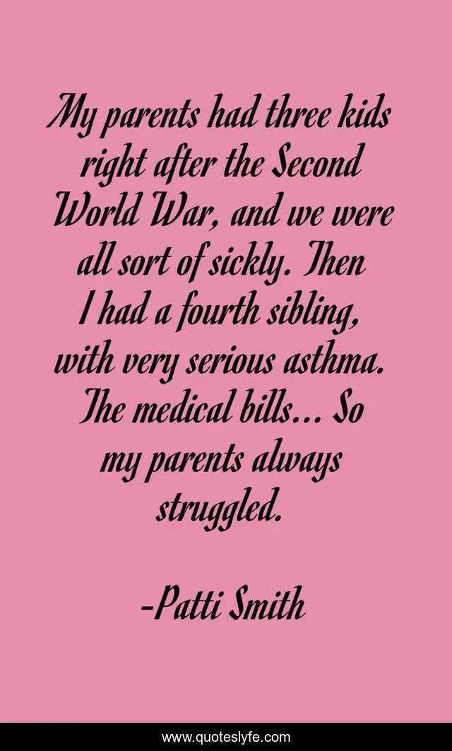 This page presents the quote "My parents had three kids right after the Second World War, and we were all sort of sickly. Then I had a fourth sibling, with very serious asthma. The medical bills... So my parents always struggled.". Author of this quote is Patti Smith. This quote is about world, parents, war,.