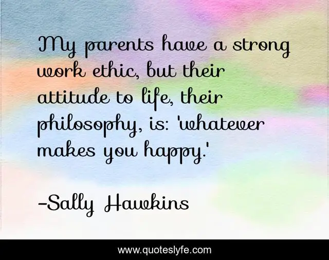 This page presents the quote "My parents have a strong work ethic, but their attitude to life, their philosophy, is: 'whatever makes you happy.'". Author of this quote is Sally Hawkins. This quote is about life, work, happy,.