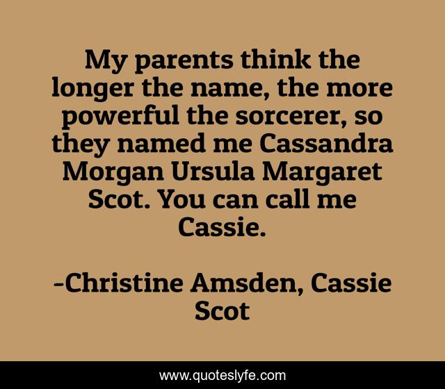 This page presents the quote "My parents think the longer the name, the more powerful the sorcerer, so they named me Cassandra Morgan Ursula Margaret Scot. You can call me Cassie.". Author of this quote is Christine Amsden, Cassie Scot. This quote is about mystery, cassie-scot, christine-amsden, urban-fantasy, paranormal, new-adult, fantasy, romance,.