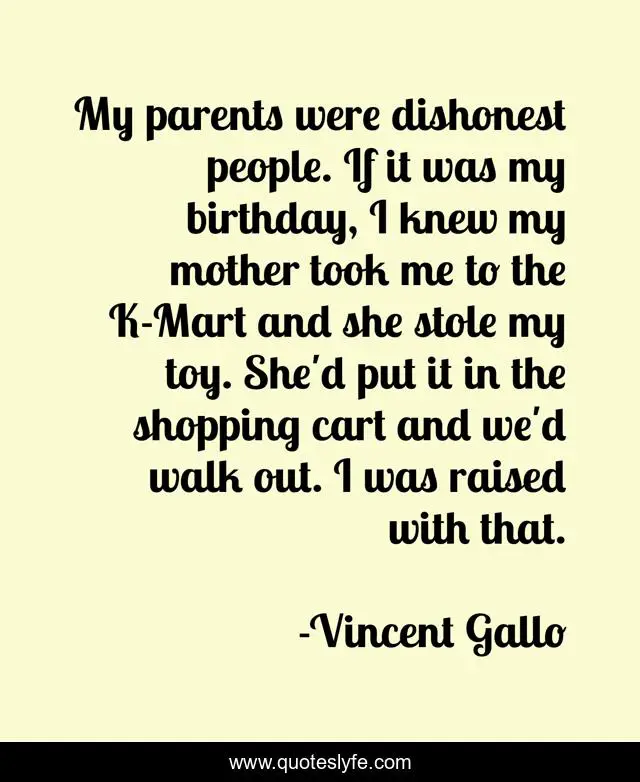 This page presents the quote "My parents were dishonest people. If it was my birthday, I knew my mother took me to the K-Mart and she stole my toy. She'd put it in the shopping cart and we'd walk out. I was raised with that.". Author of this quote is Vincent Gallo. This quote is about mother, parents, walk,.