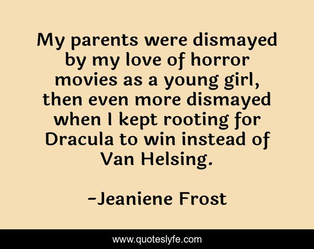 This page presents the quote "My parents were dismayed by my love of horror movies as a young girl, then even more dismayed when I kept rooting for Dracula to win instead of Van Helsing.". Author of this quote is Jeaniene Frost. This quote is about love, girl, parents, affection,.