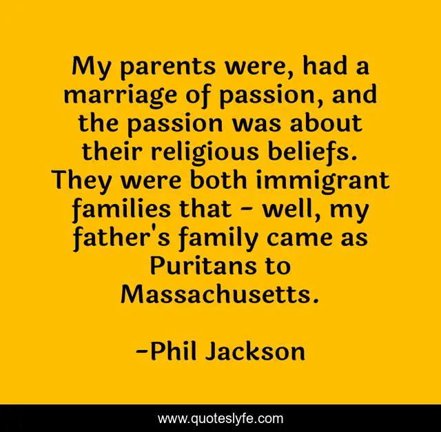 This page presents the quote "My parents were, had a marriage of passion, and the passion was about their religious beliefs. They were both immigrant families that - well, my father's family came as Puritans to Massachusetts.". Author of this quote is Phil Jackson. This quote is about father, parents, family,.