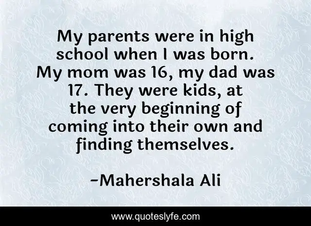 This page presents the quote "My parents were in high school when I was born. My mom was 16, my dad was 17. They were kids, at the very beginning of coming into their own and finding themselves.". Author of this quote is Mahershala Ali. This quote is about parents, school, beginning,.