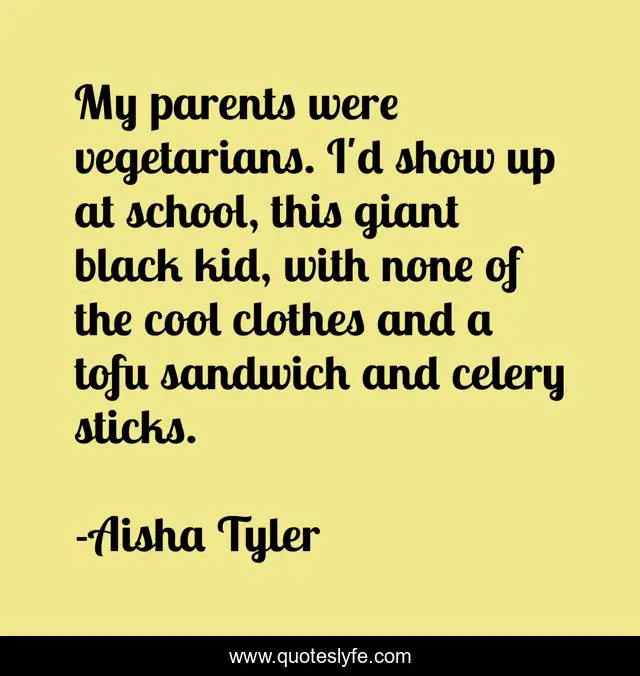 This page presents the quote "My parents were vegetarians. I'd show up at school, this giant black kid, with none of the cool clothes and a tofu sandwich and celery sticks.". Author of this quote is Aisha Tyler. This quote is about parents, school, black,.