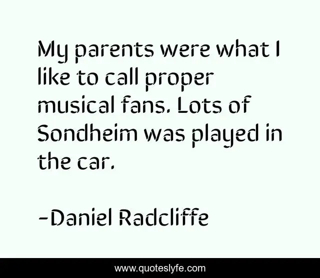 This page presents the quote "My parents were what I like to call proper musical fans. Lots of Sondheim was played in the car.". Author of this quote is Daniel Radcliffe. This quote is about fans, parents, like,.