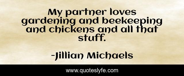 This page presents the quote "My partner loves gardening and beekeeping and chickens and all that stuff.". Author of this quote is Jillian Michaels. This quote is about partner, stuff, chickens,.