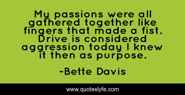 This page presents the quote "My passions were all gathered together like fingers that made a fist. Drive is considered aggression today I knew it then as purpose.". Author of this quote is Bette Davis. .