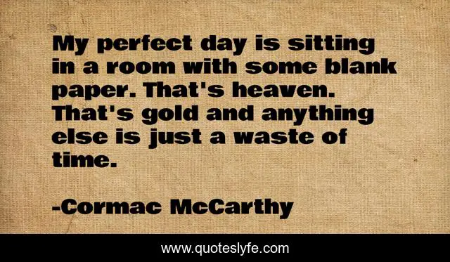 This page presents the quote "My perfect day is sitting in a room with some blank paper. That's heaven. That's gold and anything else is just a waste of time.". Author of this quote is Cormac McCarthy. .