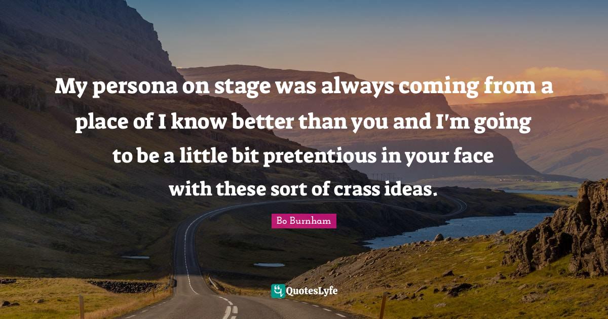 This page presents the quote "My persona on stage was always coming from a place of I know better than you and I'm going to be a little bit pretentious in your face with these sort of crass ideas.". Author of this quote is Bo Burnham. This quote is about persona, your face, little bit, faces, pretentious, littles, crass, ideas, better than you,.