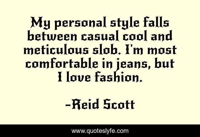 This page presents the quote "My personal style falls between casual cool and meticulous slob. I'm most comfortable in jeans, but I love fashion.". Author of this quote is Reid Scott. This quote is about style, fashion, love, affection,.