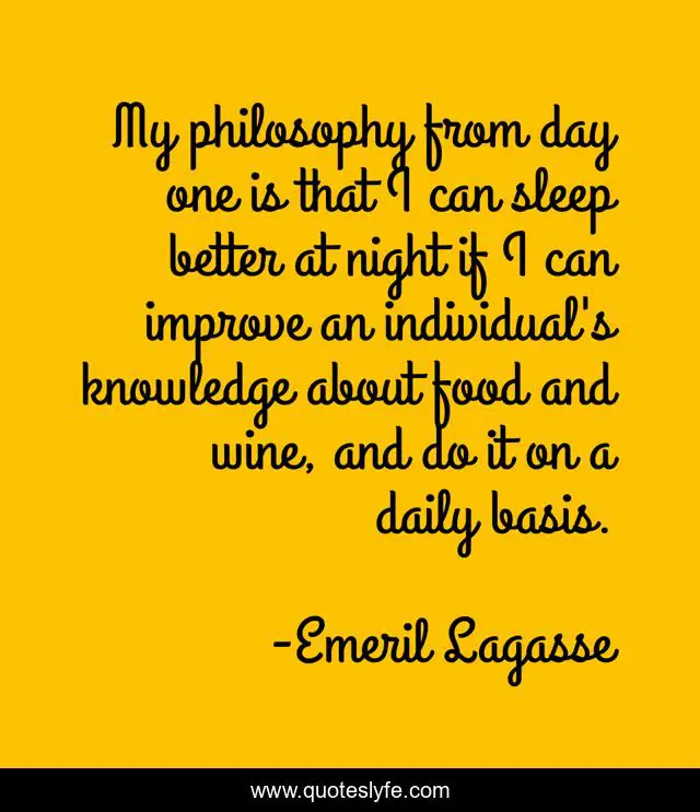 This page presents the quote "My philosophy from day one is that I can sleep better at night if I can improve an individual's knowledge about food and wine, and do it on a daily basis.". Author of this quote is Emeril Lagasse. This quote is about sleep, knowledge, daily,.