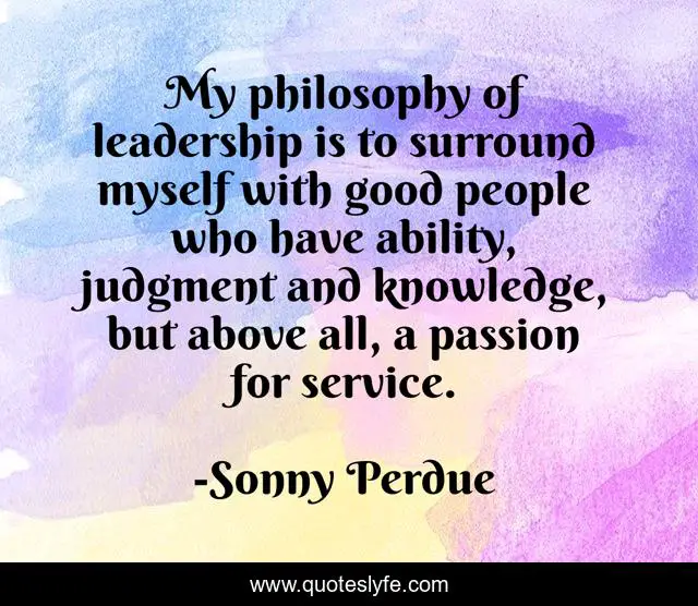 This page presents the quote "My philosophy of leadership is to surround myself with good people who have ability, judgment and knowledge, but above all, a passion for service.". Author of this quote is Sonny Perdue. This quote is about leadership, knowledge,.