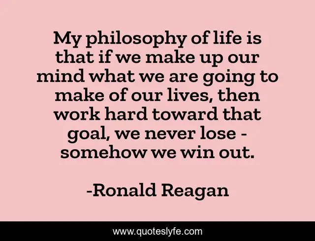 This page presents the quote "My philosophy of life is that if we make up our mind what we are going to make of our lives, then work hard toward that goal, we never lose - somehow we win out.". Author of this quote is Ronald Reagan. This quote is about life, mind, work hard,.