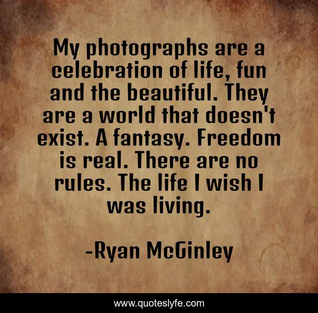 This page presents the quote "My photographs are a celebration of life, fun and the beautiful. They are a world that doesn't exist. A fantasy. Freedom is real. There are no rules. The life I wish I was living.". Author of this quote is Ryan McGinley. This quote is about beautiful, world, life,.