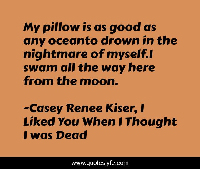 This page presents the quote "My pillow is as good as any oceanto drown in the nightmare of myself.I swam all the way here from the moon.". Author of this quote is Casey Renee Kiser, I Liked You When I Thought I was Dead. This quote is about denial, bi-polar, insanity, nightmares, depression, mental-illness,.