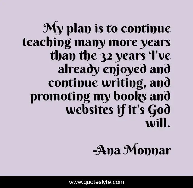 This page presents the quote "My plan is to continue teaching many more years than the 32 years I've already enjoyed and continue writing, and promoting my books and websites if it's God will.". Author of this quote is Ana Monnar. This quote is about teaching, books, promoting, websites, writing,.