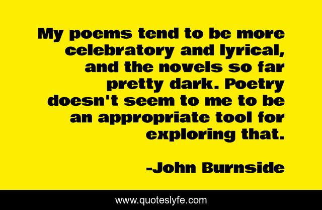This page presents the quote "My poems tend to be more celebratory and lyrical, and the novels so far pretty dark. Poetry doesn't seem to me to be an appropriate tool for exploring that.". Author of this quote is John Burnside. This quote is about me, dark, exploring,.