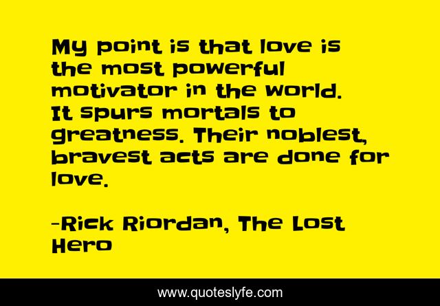 This page presents the quote "My point is that love is the most powerful motivator in the world. It spurs mortals to greatness. Their noblest, bravest acts are done for love.". Author of this quote is Rick Riordan, The Lost Hero. This quote is about love, bravery, affection,.