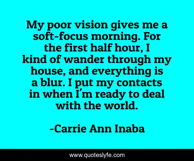 This page presents the quote "My poor vision gives me a soft-focus morning. For the first half hour, I kind of wander through my house, and everything is a blur. I put my contacts in when I'm ready to deal with the world.". Author of this quote is Carrie Ann Inaba. This quote is about me, world, vision,.