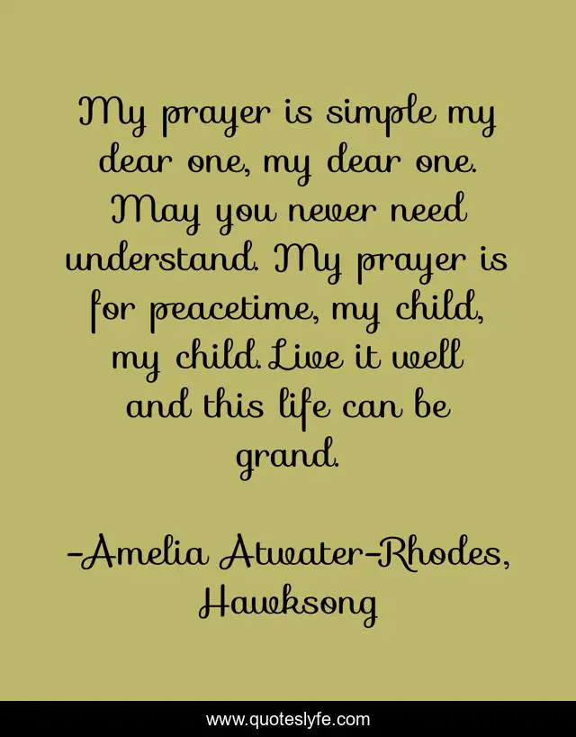 This page presents the quote "My prayer is simple my dear one, my dear one. May you never need understand. My prayer is for peacetime, my child, my child. Live it well and this life can be grand.". Author of this quote is Amelia Atwater-Rhodes, Hawksong. This quote is about life, peace,.