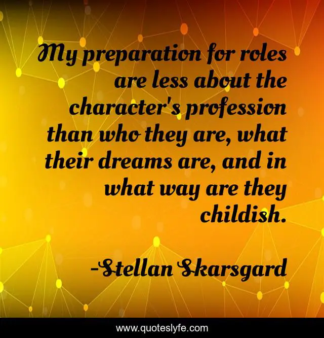 This page presents the quote "My preparation for roles are less about the character's profession than who they are, what their dreams are, and in what way are they childish.". Author of this quote is Stellan Skarsgard. This quote is about preparation, character, way,.