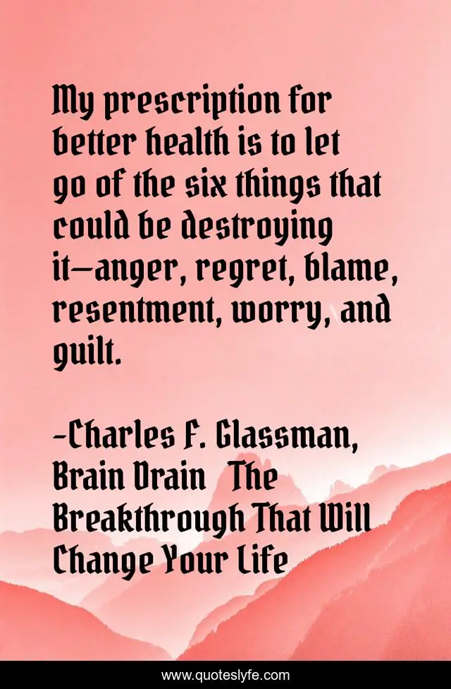 This page presents the quote "My prescription for better health is to let go of the six things that could be destroying it—anger, regret, blame, resentment, worry, and guilt.". Author of this quote is Charles F. Glassman, Brain Drain The Breakthrough That Will Change Your Life. This quote is about healthy-living, blame-others, guilt, worry,.