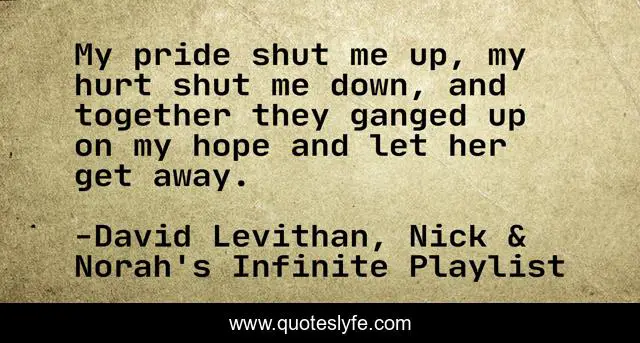 This page presents the quote "My pride shut me up, my hurt shut me down, and together they ganged up on my hope and let her get away.". Author of this quote is David Levithan, Nick & Norah's Infinite Playlist. This quote is about hurt, pride, hope, sad,.