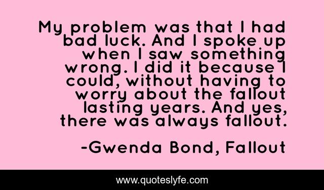 This page presents the quote "My problem was that I had bad luck. And I spoke up when I saw something wrong. I did it because I could, without having to worry about the fallout lasting years. And yes, there was always fallout.". Author of this quote is Gwenda Bond, Fallout. This quote is about lois-lane, dc-comics, comics, reporter, bad-luck, fallout, young-adult, superman,.