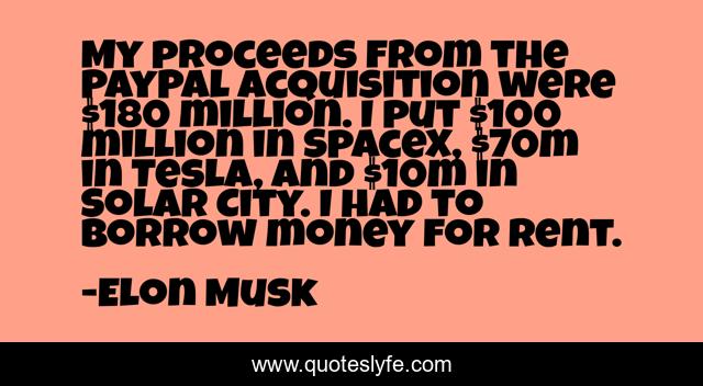 This page presents the quote "My proceeds from the PayPal acquisition were $180 million. I put $100 million in SpaceX, $70m in Tesla, and $10m in Solar City. I had to borrow money for rent.". Author of this quote is Elon Musk. This quote is about spacex, perseverance, inspirational, enthusiasm,.
