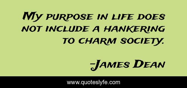 This page presents the quote "My purpose in life does not include a hankering to charm society.". Author of this quote is James Dean. This quote is about life, charm, purpose,.