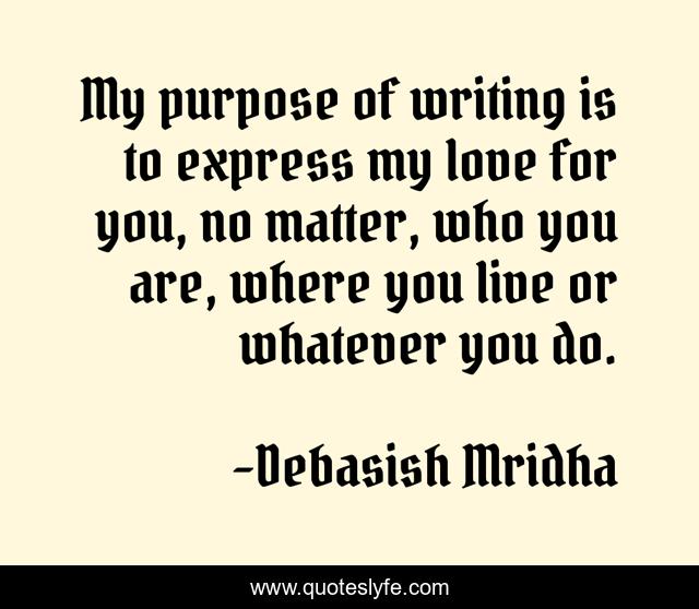 This page presents the quote "My purpose of writing is to express my love for you, no matter, who you are, where you live or whatever you do.". Author of this quote is Debasish Mridha. This quote is about life, debasish, love, mridha, philosophy, writing, affection,.