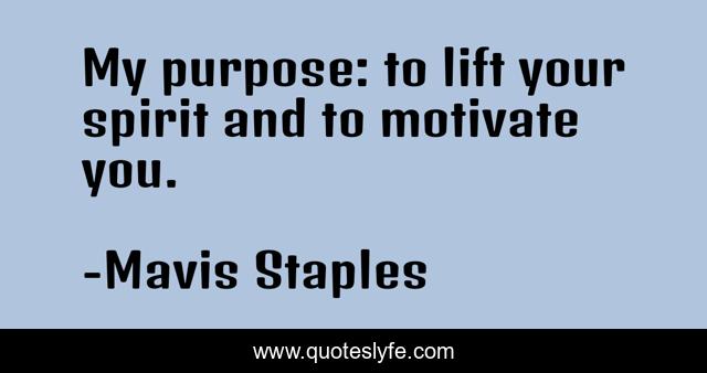 This page presents the quote "My purpose: to lift your spirit and to motivate you.". Author of this quote is Mavis Staples. This quote is about lift, purpose,.
