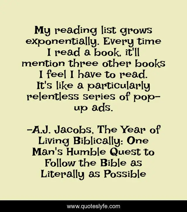 "A.J. Jacobs, The Year of Living Biblically: One Man's Humble Quest to Follow the Bible as Literally as Possible Quotes." Quoteslyfe.com, 2025. Fri. 05 Dec. 2025. <https://www.quoteslyfe.com/quote/My-reading-list-grows-exponentially-Every-time-5930>.