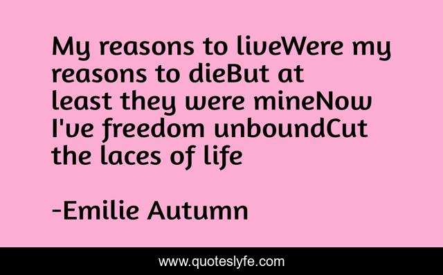 This page presents the quote "My reasons to liveWere my reasons to dieBut at least they were mineNow I've freedom unboundCut the laces of life". Author of this quote is Emilie Autumn. This quote is about freedom, life, death,.