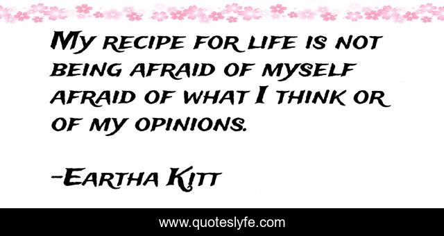 This page presents the quote "My recipe for life is not being afraid of myself afraid of what I think or of my opinions.". Author of this quote is Eartha Kitt. This quote is about self, acceptance,.