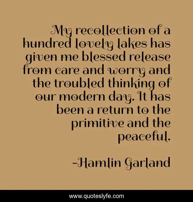 This page presents the quote "My recollection of a hundred lovely lakes has given me blessed release from care and worry and the troubled thinking of our modern day. It has been a return to the primitive and the peaceful.". Author of this quote is Hamlin Garland. This quote is about thinking, day, blessed,.