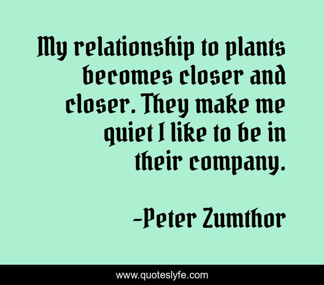This page presents the quote "My relationship to plants becomes closer and closer. They make me quiet I like to be in their company.". Author of this quote is Peter Zumthor. This quote is about me, plants, company,.