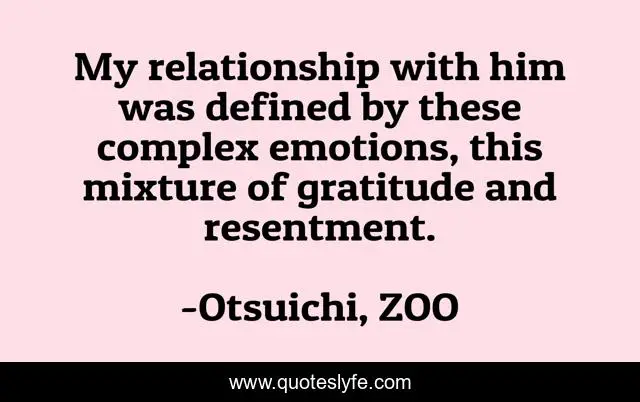 This page presents the quote "My relationship with him was defined by these complex emotions, this mixture of gratitude and resentment.". Author of this quote is Otsuichi, ZOO. This quote is about gratitude, relationships, complicated-relationship, complicated-relationships, robots, emotions, resentment, complex, complicated,.