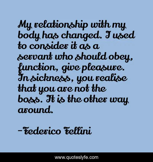 This page presents the quote "My relationship with my body has changed. I used to consider it as a servant who should obey, function, give pleasure. In sickness, you realise that you are not the boss. It is the other way around.". Author of this quote is Federico Fellini. This quote is about body, boss, sickness,.