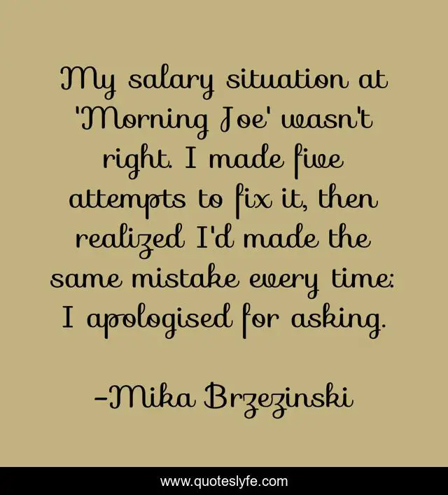 This page presents the quote "My salary situation at 'Morning Joe' wasn't right. I made five attempts to fix it, then realized I'd made the same mistake every time: I apologised for asking.". Author of this quote is Mika Brzezinski. This quote is about situation, time, mistake,.