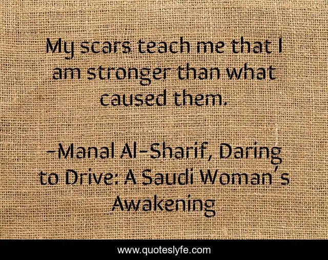 "Manal Al-Sharif, Daring to Drive: A Saudi Woman’s Awakening Quotes." Quoteslyfe.com, 2025. Sat. 06 Dec. 2025. <https://www.quoteslyfe.com/quote/My-scars-teach-me-that-I-am-147534>.