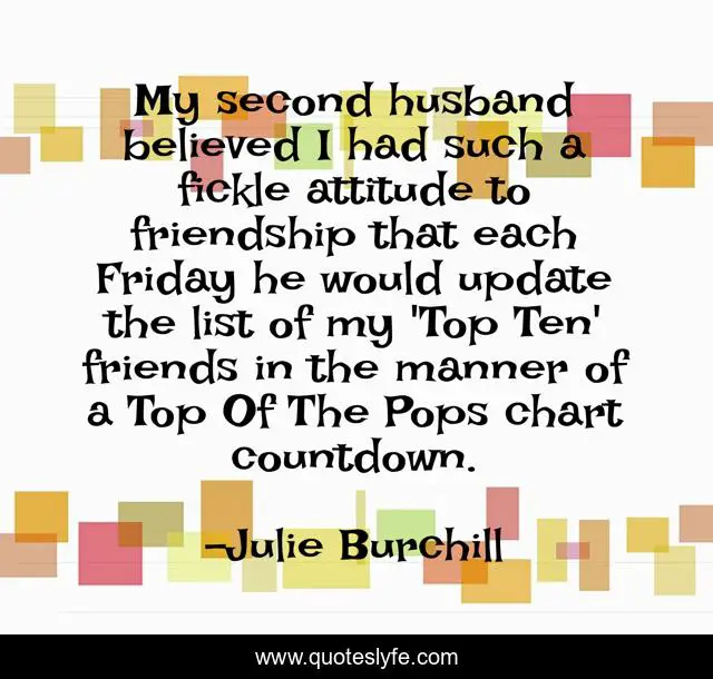 This page presents the quote "My second husband believed I had such a fickle attitude to friendship that each Friday he would update the list of my 'Top Ten' friends in the manner of a Top Of The Pops chart countdown.". Author of this quote is Julie Burchill. This quote is about friendship, friends, husband,.