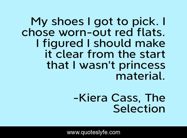 This page presents the quote "My shoes I got to pick. I chose worn-out red flats. I figured I should make it clear from the start that I wasn’t princess material.". Author of this quote is Kiera Cass, The Selection. .