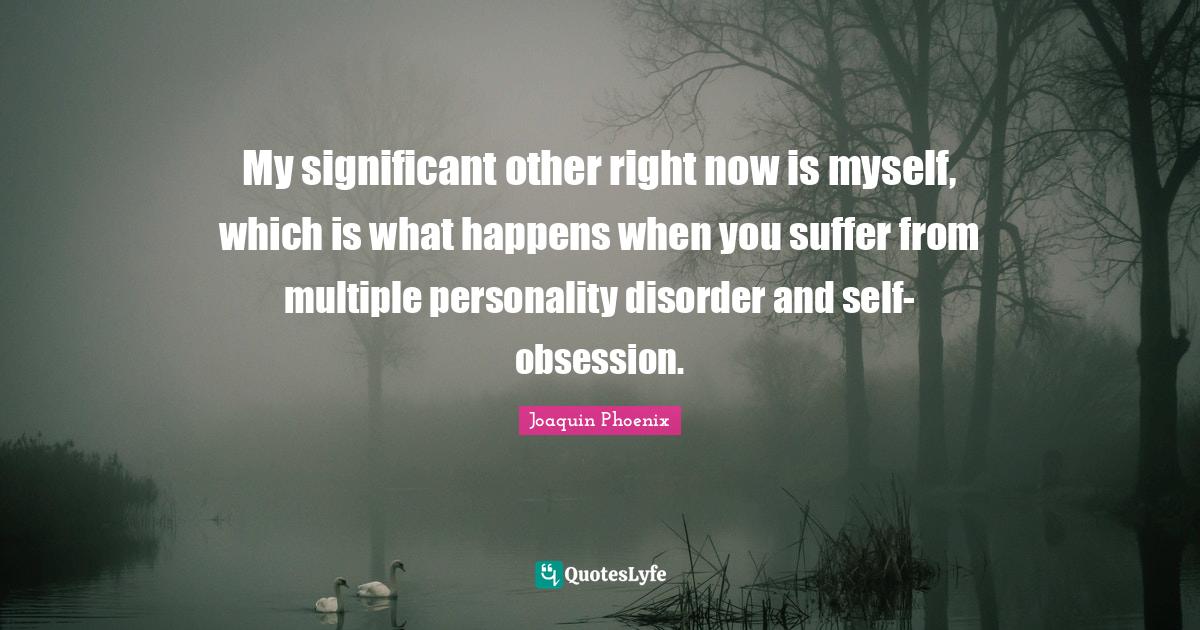 This page presents the quote "My significant other right now is myself, which is what happens when you suffer from multiple personality disorder and self-obsession.". Author of this quote is Joaquin Phoenix. This quote is about significant other, self, personality, happens, disorder, multiple, suffering, obsession, right now,.